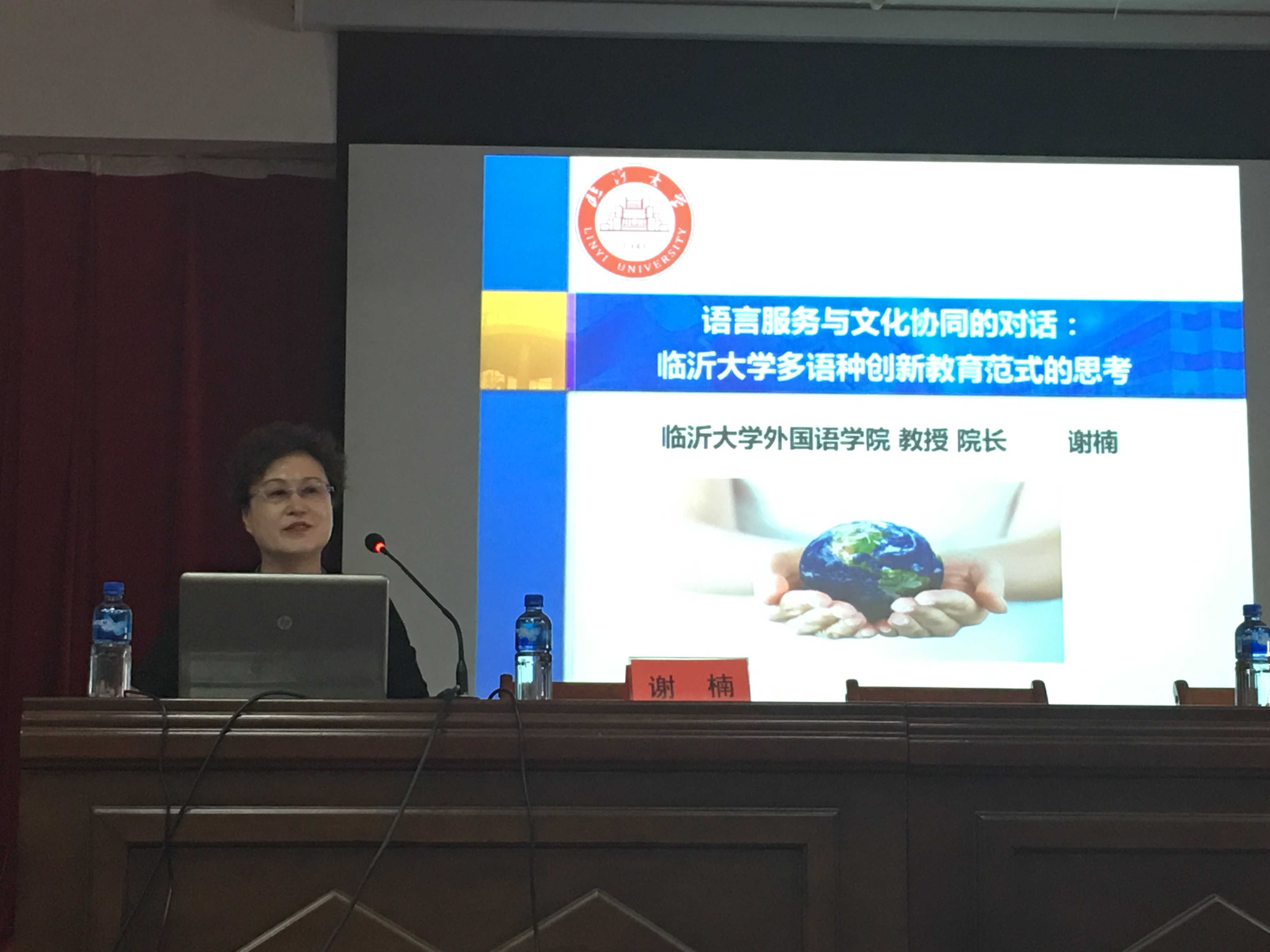 谢楠教授做了“语言服务与文化协同的对话——临沂大学多语种创新教育范式的思考”的主题发言,谢楠指出外国语学院在提供语言服务方面具有得天独厚的条件,临沂大学外国语学院对接国家“一带一路”倡议,建设有英语、俄语、法语、西班牙语等7个多语种专业。探寻“语言+X”的专业转型,在商务英语专业中开设跨境电子商务课程,切实助力临沂商贸物流的发展;组建了会展翻译实习团队、多语种翻译团队、创新创业园等,将语言服务做到实处,服务于临沂社会经济发展。谢楠指出伴随着文化生活的提高和信息化时代的发展,人们对语言服务的要求越来越高,语言服务的内容也更加丰富,外国语学院具有提供语言服务的优势,在人才培养中更加要强调语言能力的实际运用。同时,外国语学院建设了校级认知科学与语言学能基地,成立了山东省“一带一路”中外民俗文化研究中心,在进行语言教学的同时,将国外先进文化引进来,更重要的是让中国文化走出去,用语言服务引领文化协同,不断驱动经济、社会、文化、科技等领域的创新发展。