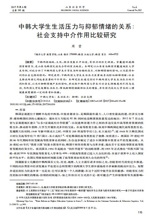 成果简介:本研究以山东省与韩国京畿道地区大学生为例,对比分析了中韩两国大学生日常生活所面临的压力、对抑郁情绪的影响,以及获得和利用社会支持的情况。研究表明,中韩两国大学生生活压力显著影响抑郁情绪; 社会支持在两者之间起显著的中介作用。本研究旨在通过探讨中韩两国大学生生活压力的不同和原因,以及对抑郁情绪产生的影响,并比较中韩两国大学生对社会支持维度的不同与成因,为两国大学生缓解生活压力、降低抑郁情绪提供相互的借鉴,并为国内高校大学生的心理健康教育提供一定的参考和依据。