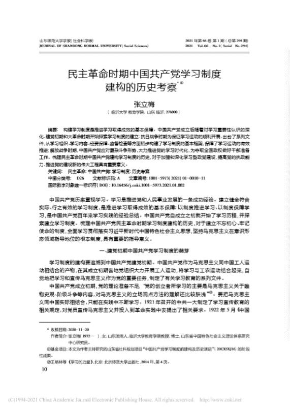 成果简介:构建学习制度是推进学习取得成效的基本保障。中国共产党成立后随着对学习重要性认识的深化,建党初期和大革命时期开始探索学习制度的建立;抗日战争时期为保证学习运动的顺利开展,出台了系列文件,从学习组织、学习内容、经费保障、监督检查等方面初步构建了学习制度的基本框架,保障了学习运动的有效推进;解放战争时期,中国共产党应对复杂斗争形势,大力推进党的学习时代化,为夺取全国政权做好干部准备工作。梳理民主革命时期中国共产党建构学习制度的历史,对于加强和深化学习型政党建设,提高党的执政能力,推进党的建设新的伟大工程具有重要意义。
