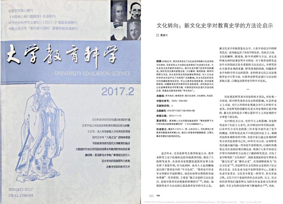 成果简介:20世纪末,西方史学发生了从社会史学到新文化史学的文化转向,历史研究从文化的社会史转向了社会的文化史,文化史成为史学家研究的中心,新文化史引领了史学研究的潮流。其研究范式具有底层立场、文化解释、微观视角、跨学科视野与方法、多元史料观及回归叙事史等特征,对人文社会科学研究方法产生了深刻而广泛的影响。作为与历史研究有深切渊源的教育史研究,可以从教育史观的更新、研究视角的转换、问题教育史学和跨学科方法的倡导、史料的多元化以及叙事教育史书写等方面,对教育史研究史进行方法论的反思,希冀走出教育史学的“学术危机”。