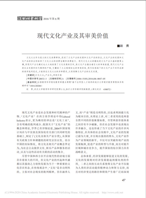 成果简介:文化大众作为庞大的文化消费群体,促进了文化产业的发展和文化产品的供应,文化产业的发展和文化产品的供应则培养了文化大众的消费旨趣和消费能力。现代文化大众的崛起是文化产业兴盛的重要土壤,而现代产业化模式也大大地拓展了文化发展的空间,使文化产业蕴含着巨大的审美能量。现代文化产业是社会发展和时代精神的产物,它囊括了大众栩栩如生的审美经验。现代性视域下的文化产业只有形成新的美学批判范式,才能保证文化大众的多种需求,从而保障文化产业的长足发展。