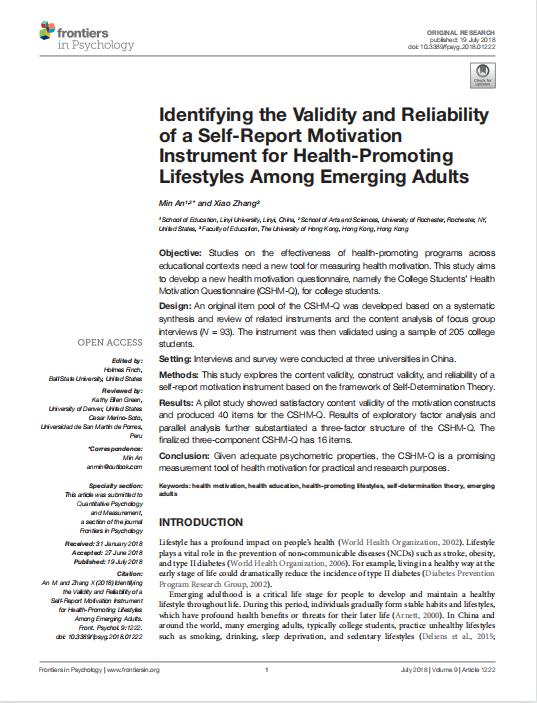 成果简介:本研究成果遵循经典测验理论的思路方法,报告了大学生健康动机问卷的信效度。研究结果显示,该问卷的测量学特征较好,可用于中国大学生健康动机的测量与评价。