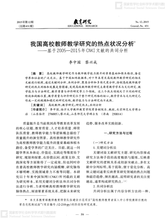 成果简介:高校教师教学研究作为教师教学能力提升的重要基础和根本路径,备受学界和社会的广泛关注。基于中国知网数据库,对十年来有关高校教师教学研究的相关文献进行梳理,通过关键词分析、共词分析、聚类分析和多维尺度分析,绘制高校教师教学研究的热点网络和发展走势图谱,发现高校教师教学研究主要有教学学术与文化研究、教学能力与方法研究、教学质量与评价研究等三个领域。这三个热点领域处于不同的研究阶段和战略位置,教学质量与评价研究位于整个研究网络的核心,教学学术与文化研究已形成一定的规模和稳定的研究结构,教学能力与方法研究尚不成熟。