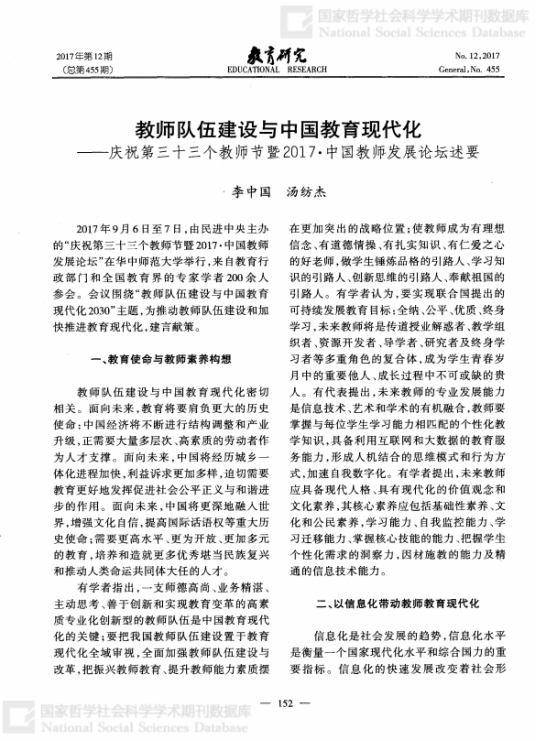 成果简介:教师队伍建设与中国教育现代化密切相关。面向未来,教育将要肩负更大的历史使命,迫切需要教育更好地发挥促进社会公平正义与和谐进步的作用,更深地融人世界,增强文化自信,提高国际话语权等重大历史使命。教师教育走向现代化,应着力做好四个方面的工作:一是用信息化带动现代化;二是加强教师教育学科专业建设;三是转变教学模式,发挥课堂教学的知识生成和生命生成的双重作用,四是创新网络评价方式,重视信息技术对教育的影响及其带来的新的评价问题。