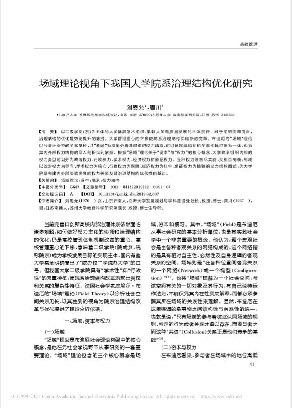 成果简介:以二级学院(系)为主体的大学基层学术组织,承载大学高质量发展的主体责任。对于组织变革而言,治理结构的优化是效能提升的前提。大学管理重心的下移使院系治理结构面临新的变革。布迪厄的场域理论以分析社会空间关系见长,以场域为视角分析基层组织权力结构,可以使其结构化和关系性特征融为一体,也为其内外部权力结构的深入剖析找到依据。根据场域理论关于资本与权力的核心概念,大学院系组织内部的权力类型可划分为政治权力、行政权力、学术权力、经济权力和象征权力。五种权力既各尽其能,又相互制衡,形成以政治权力为导向、学术权力为核心、行政权力为保障、经济权力为杠杆、象征权力为精髓的权力结构图式,为大学院系构建内外部协调发展的权力关系及其治理结构的优化提供基础。
