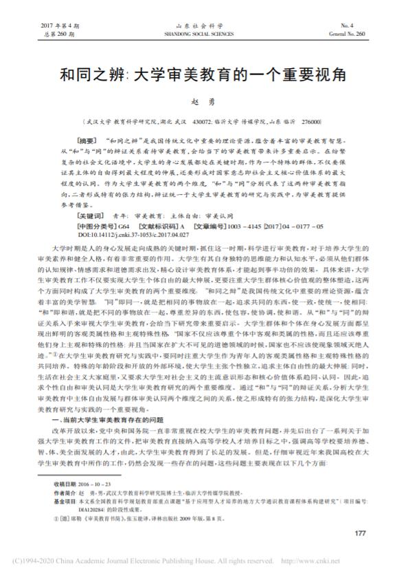 成果简介:和同之辨是我国传统文化中重要的理论资源,蕴含着丰富的审美教育智慧。从和与同的辩证关系看待审美教育,会给当下的审美教育带来许多重要启示。在纷繁复杂的社会文化语境中,大学生的身心发展都处在关键时期,作为一个特殊的群体,不仅要保证其主体的自由得到最大程度的伸展,还要形成对国家意志即社会主义核心价值体系的最大程度的认同。作为大学生审美教育的两个维度,和与同分别代表了这两种审美教育指向,二者形成特有的张力结构,辩证统一于大学生审美教育的研究与实践中,为审美教育提供参考借鉴。