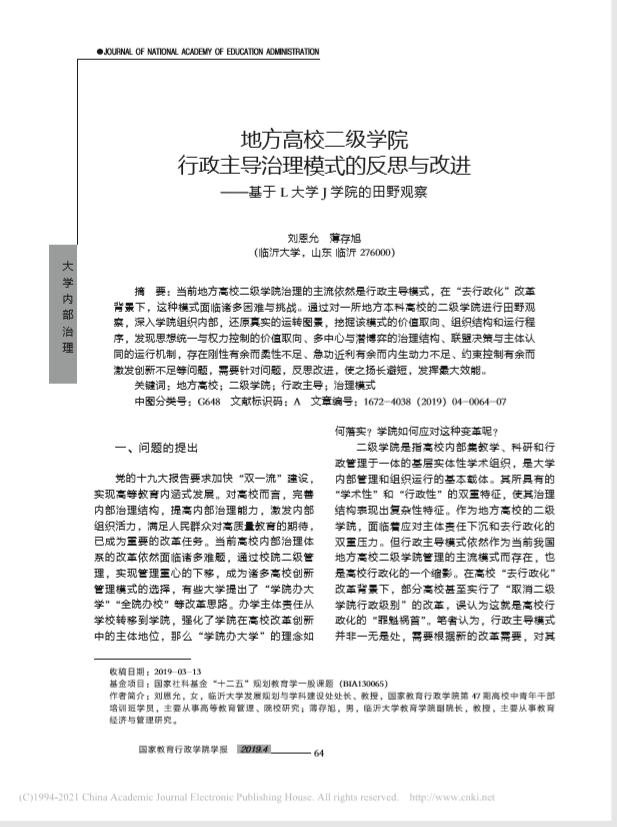 地方高校二级学院行政主导治理模式的反思与改进——基于L大学J学院的田野观察
