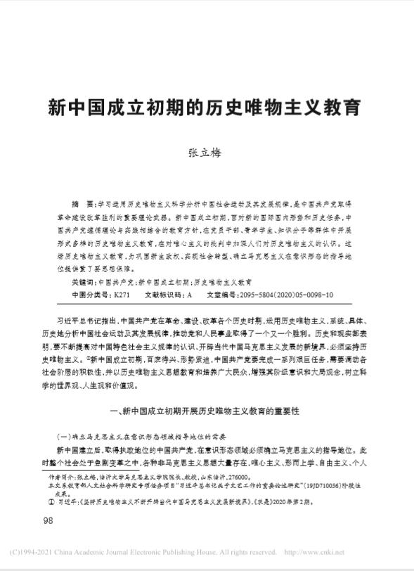 成果简介:学习运用历史唯物主义科学分析中国社会运动及其发展规律,是中国共产党取得革命建设改革胜利的重要理论武器。新中国成立初期,面对新的国际国内形势和历史任务,中国共产党遵循理论与实践相结合的教育方针,在党员干部、青年学生、知识分子等群体中开展形式多样的历史唯物主义教育,在对唯心主义的批判中加深人们对历史唯物主义的认识。这场历史唯物主义教育,为巩固新生政权、实现社会转型、确立马克思主义在意识形态的指导地位提供重了要思想保障。