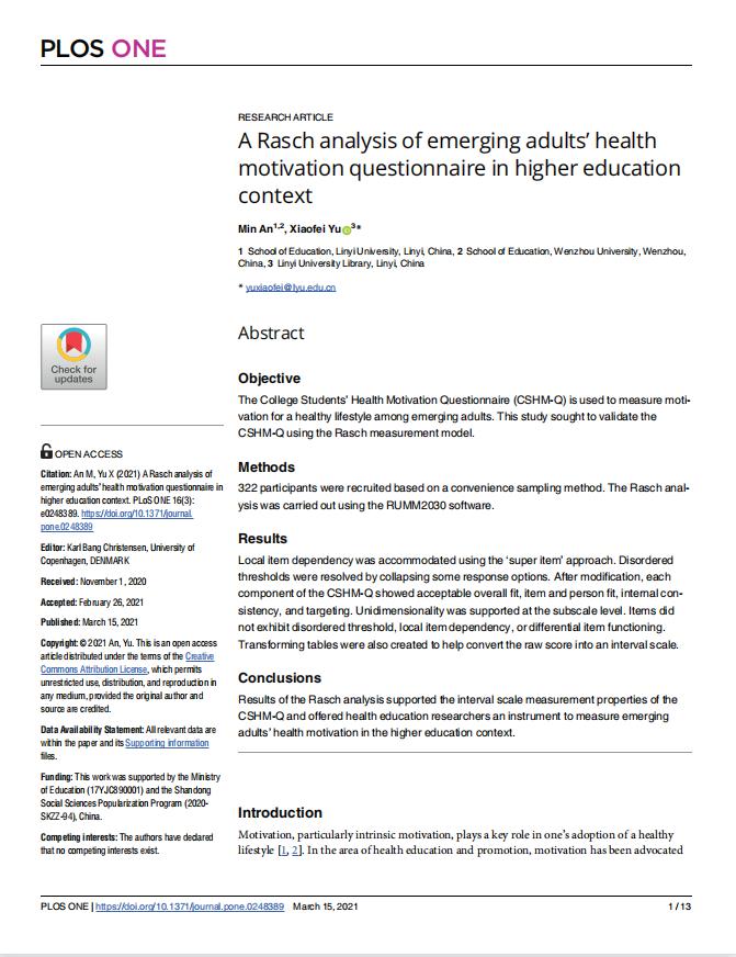 成果简介:本研究成果是之前研究(An & Zhang, 2018)的延伸。Rasch 模型(Rasch, 1960)是由丹麦数学家和统计学家 Georg Rasch基于项目反应理论提出的一个潜在特质模型,是一个著名的统计学模型。本研究运用现代测验理论的方法,利用RUMM2030软件,从模型的总体拟合效果,个体离散指数,标的性和量表潜在特质的单维性等几个方面,对健康动机量表中国大学生群体中的测量效果进行评价。研究结果表明:① 该测验基本符合其测量目标,能较好地区分出学生健康动机水平和题目难度;② 题目较简单,学生健康水平范围大于题目难度分布,应增加部分高难度题目;③存在个别题目与模型预期的结果不一致,需进一步分析其内容与答题状况。该量表总体上能够准确地进行对研究样本的健康动机水平进行参数估计,是一套质量较高的测验。
