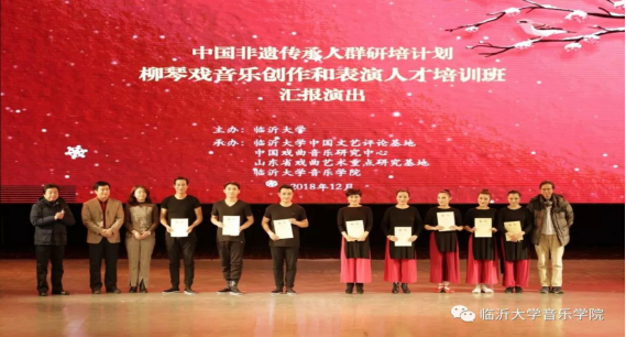 2018年12月27日晚,由临沂大学主办,临沂大学中国文艺评论基地、中国戏曲音乐研究中心、山东省戏曲艺术重点研究基地以及临沂大学音乐学院承办的中国非遗传承人群研培计划柳琴戏音乐创作人才培训班和柳琴戏表演人才培训班结业汇报演出在临沂大学艺术中心大剧院圆满落幕。