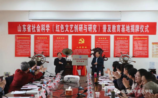 2019年11月26日上午,山东省社会科学(红色文艺创作与传承创新研究)普及教育基地揭牌仪式在我院举行。山东省社科联党组副书记、副主席周忠高,临沂大学党委委员、副校长张立富,山东省社会科学界联合会名誉院长吕季明,山东省教育厅体艺卫处副处长周森,山东文艺创作研究院院长官明亮,中央音乐学院指挥系教授王甫建,临沂大学社科处处长李中国教授,临沂大学教育学部主任陈建国教授,临沂大学音乐学院党委书记许崇波,临沂大学音乐学院副院长(主持工作)王秀庭教授等出席仪式。省内部分艺术院校专家学者,我院骨干教师和学生代表参加会议。