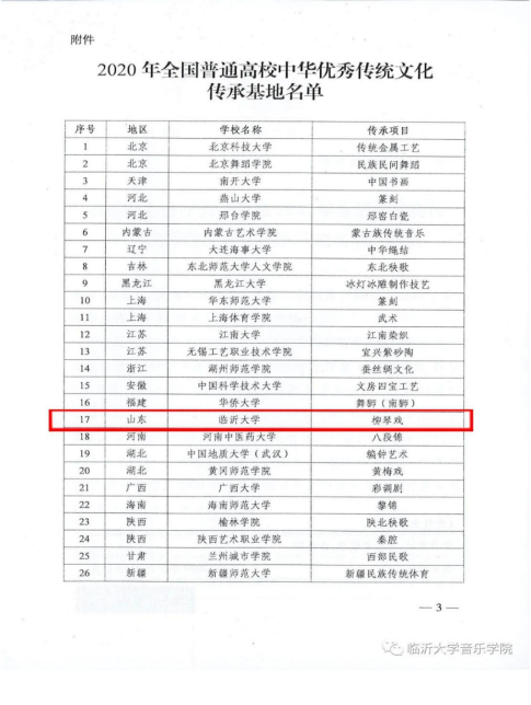 为深入贯彻落实习近平总书记关于教育的重要论述和全国教育大会精神,推进中华优秀传统文化全方位融入高校教育,根据《教育部关于开展中华优秀传统文化传承基地建设的通知》(教体艺函〔2018〕5号)和《教育部办公厅关于开展2020年中华优秀传统文化传承基地遴选工作的通知》(教体艺厅函〔2020]16号),经高校自主申报、省级教育行政部门推荐、专家遴选与公示,教育部认定26个基地为2020年全国普通高校中华优秀传统文化传承基地,其中临沂大学音乐学院申报的柳琴戏项目名列其中。
